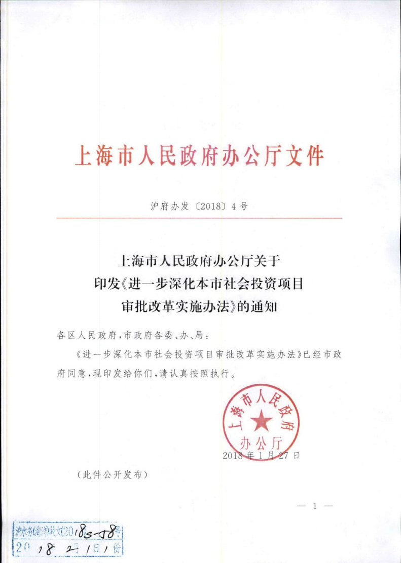 上海市人民政府办公厅关于印发《进一步深化本市社会投资项目审批改革实施办法》的通知(沪府办发〔2018〕4 号 )