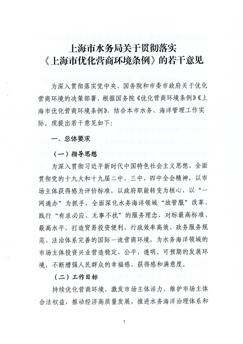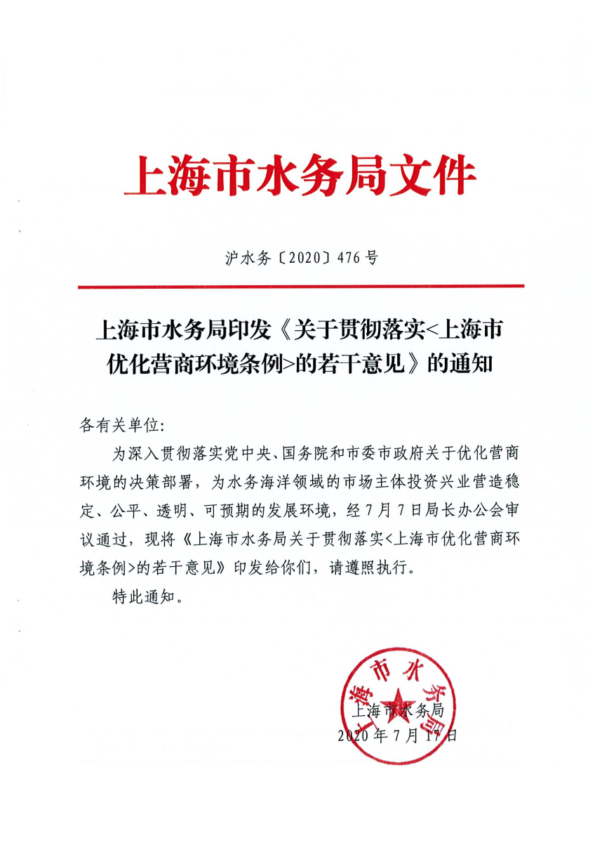 上海市水务局印发《关于贯彻落实<上海市优化营商环境条例>的若干意见》的通知