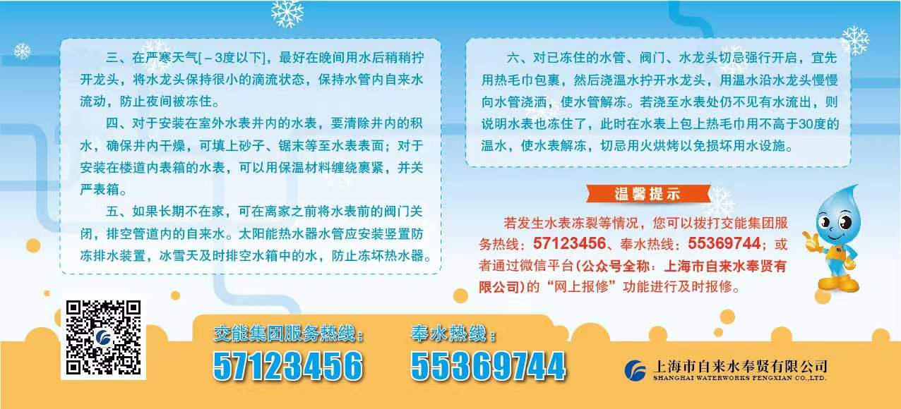 温馨提示:若发生水表冻裂等情况,您可以拨打交能集团服务热线:57123456、奉水热线:55369744;或者通过微信平台(公众号全称:hot热竞技平台下载)的“网上报修”功能进行及时报修。